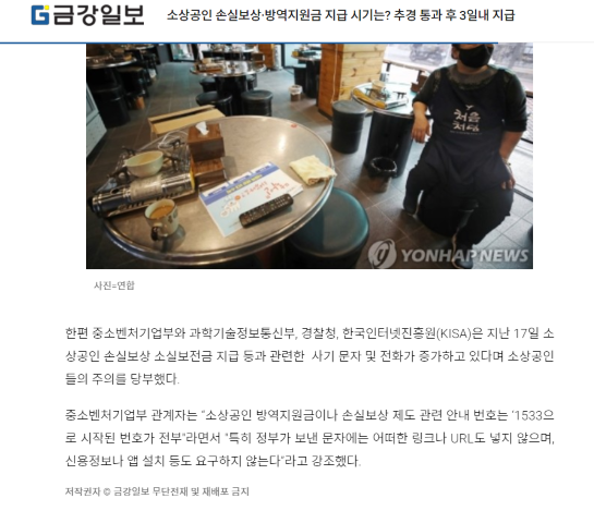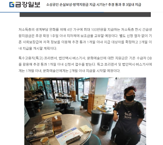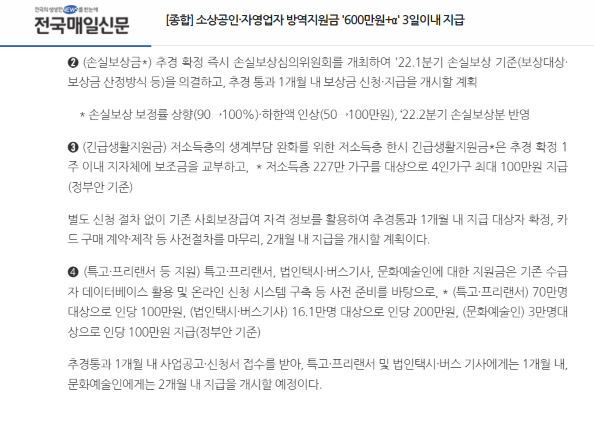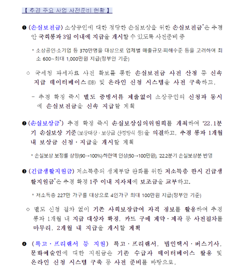 손실 보전금 : 소상공인에 대한 정당한 손실 보상을 위한 손실보전금은 추경안 국회 통과 3일 이내 지급 개시 가능하도록 사전준비 중