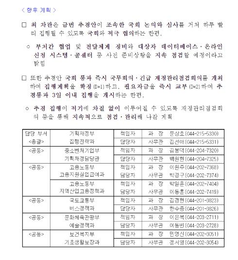 금번 추경안이 조속한 국회 논의와 심사를 거쳐 하루빨리 집행될 수 있도록 국회와 적극 협의하는 한편, 부. 처간 협업 및 전달체계 정비와 대상자 데이터 베이스. 온라인 신청 시스템. 콜센터 등 지속 점검할 예정입니다.