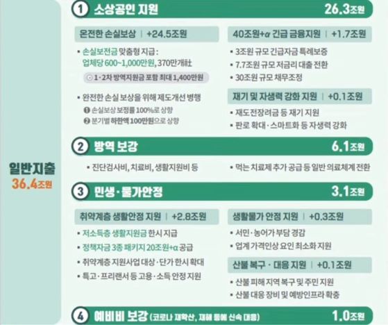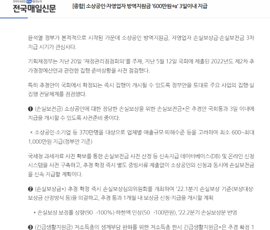 손실 보전금 : 소상공인에 대한 정당한 손실 보상을 위한 손실보전금은 추경안 국회 통과 3일 이내 지급 개시 가능하도록 사전준비 중