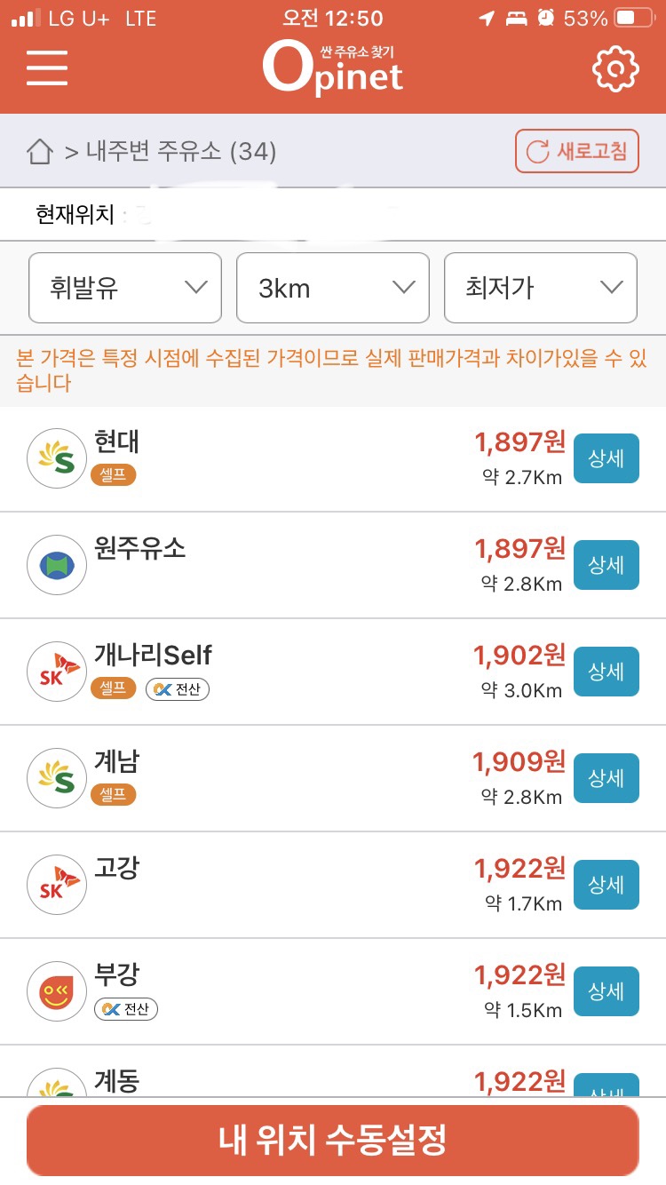 지역과 유종을 선택하고 주유소를 검색하면 주유소와 주유소 가격이 나와 저렴한 주유소를 검색할 수 있습니다.